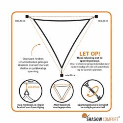 Ben je op zoek naar een stijlvolle en praktische oplossing om je buitenruimte te transformeren? Het driehoekige schaduwdoek van 3x3x3 meter biedt niet alleen verkoelende schaduw, maar voegt ook een modern accent toe aan je tuin, terras of veranda. Of je nu wilt ontspannen met een boek, genieten van een gezellige barbecue of gewoon beschermd wilt zijn tegen de zon, dit veelzijdige schaduwdoek maakt het mogelijk. Ontdek de unieke voordelen van dit schaduwdoek en maak van jouw buitenruimte een stijlvolle en comfortabele plek om te genieten. Let er wel op dat schaduwdoeken een curve hebben, zodat het doek goed opgespannen kan worden.