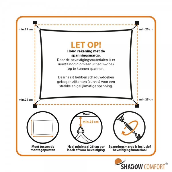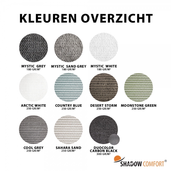 Ben jij op zoek naar een schaduwdoek van 2x3 meter? Met de schaduwdoeken van Nettenverkoop creëer je eenvoudig een koele plek in jouw tuin of op jouw balkon. Kies uit 10 verschillende kleuren en jouw schaduwdoek wordt binnen 2 werkdagen geleverd. Let er wel op dat schaduwdoeken een curve hebben, zodat het doek goed opgespannen kan worden.